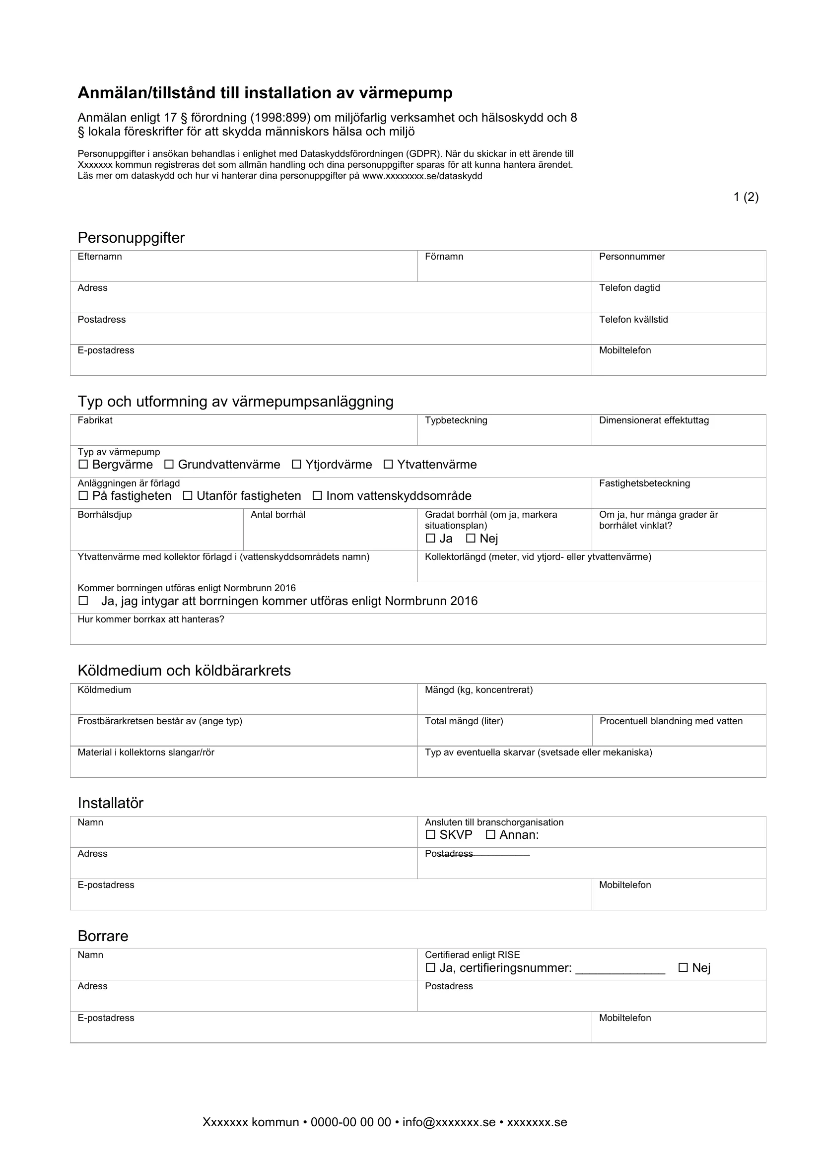 Här visar vi ett exempel på en ansökningsblankett för energibrunn, så att du vet vilka frågor du kan förväntas besvara när du söker tillstånd för borrning bergvärme. Den fungerar som en praktisk guide och förberedelse inför din egen energibrunn ansökan.